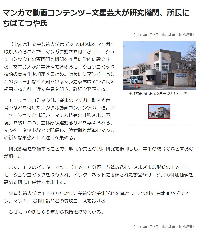 Re: マンガで動画コンテンツ−文星芸大が研究機関、所長にちばてつや氏 (日刊工業)
